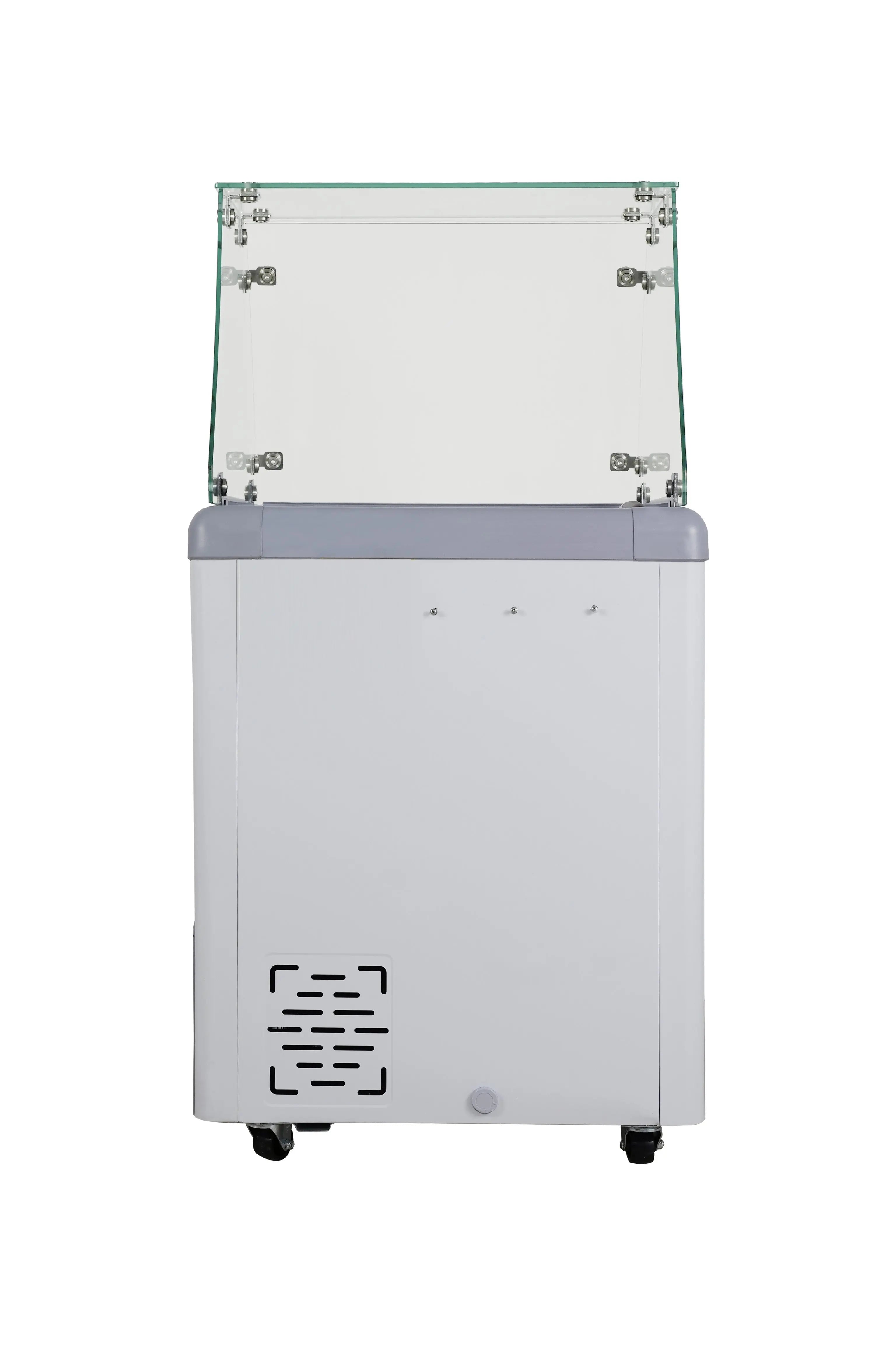 Despite its compact size, the FG-150 offers excellent storage flexibility, allowing you to display 4 tubs on top while storing 2 additional tubs underneath for quick restocking. The smooth-sliding flat glass lids make it easy to access products while maintaining consistent internal temperatures, ensuring your ice cream remains perfectly frozen and ready to serve.